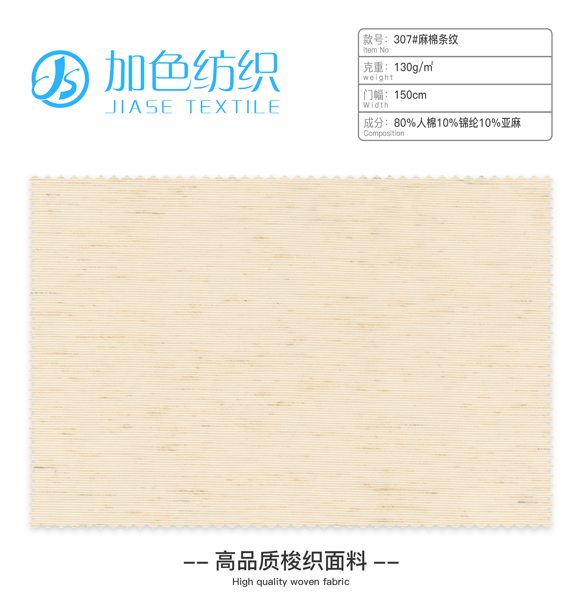 307#麻棉条纹 发布人:马咏思 供应商:广州市加色纺织厂 发布时间:2025-04-11 联系电话: 面料属性名称:307#麻棉条纹编号:307#麻棉条纹色号:色卡,1,2,3,4,5,6,7,8,9幅宽:150cm克重:130g/㎡成分:80%人棉10%锦纶10%亚麻